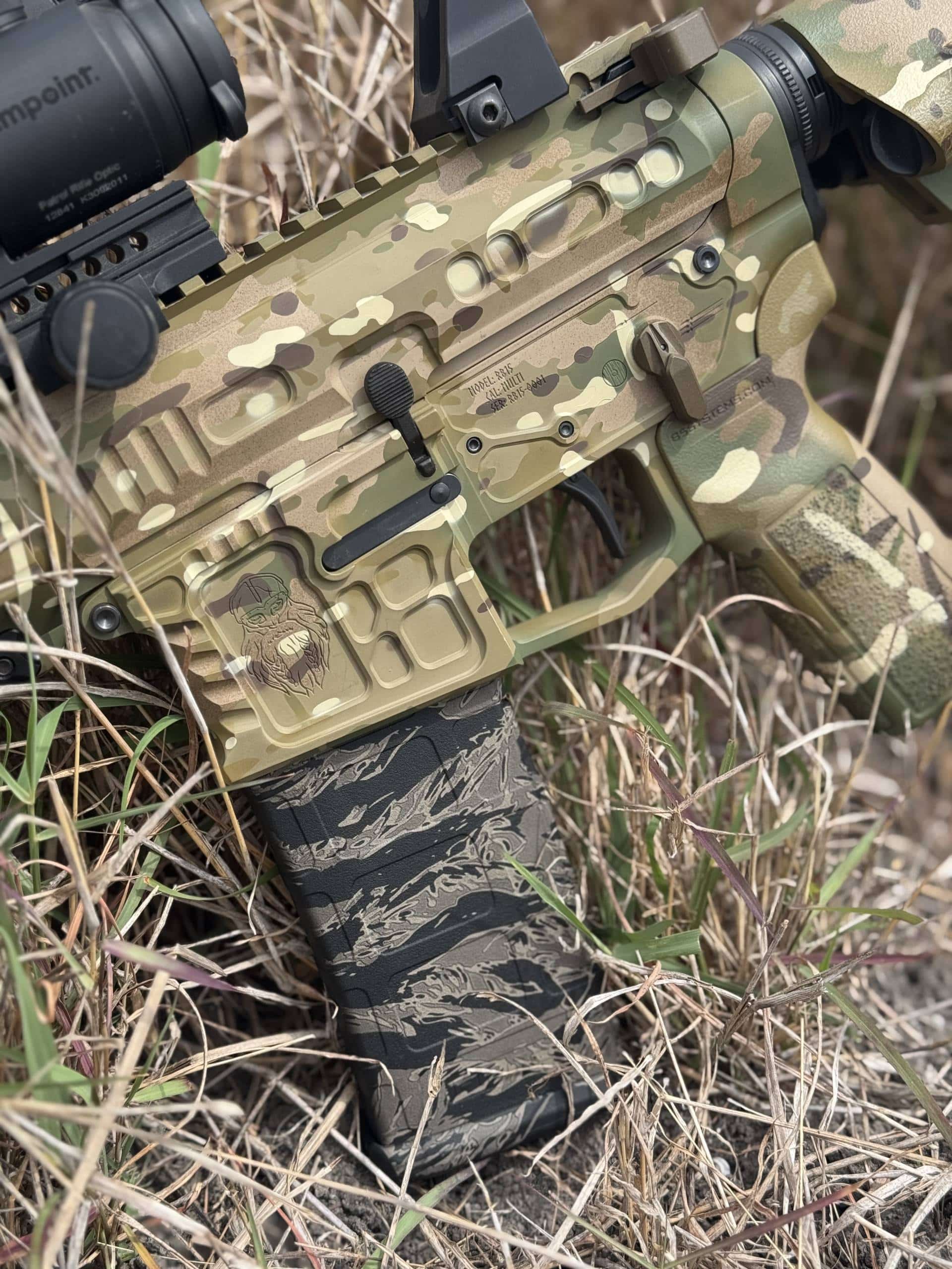 These 30 round 5.56 Magpul Gen 2 Pmags are lasered in house in a tiger stripe pattern.  They fit all standard AR-15s.